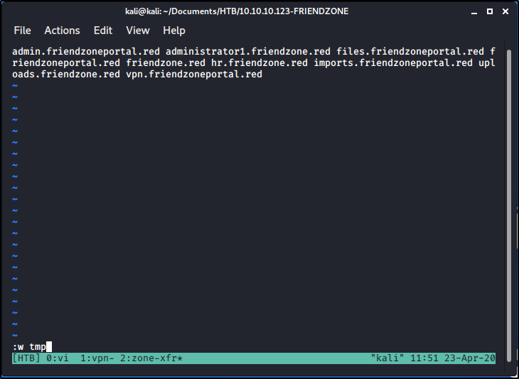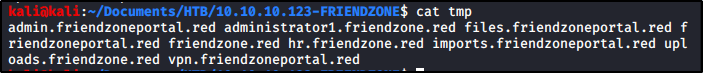 sudo dig axfr @10.10.10.123 friendzone.red >> zonetransfersudo dig axfr @10.10.10.123 friendzoneportal.red >> zonetransfer