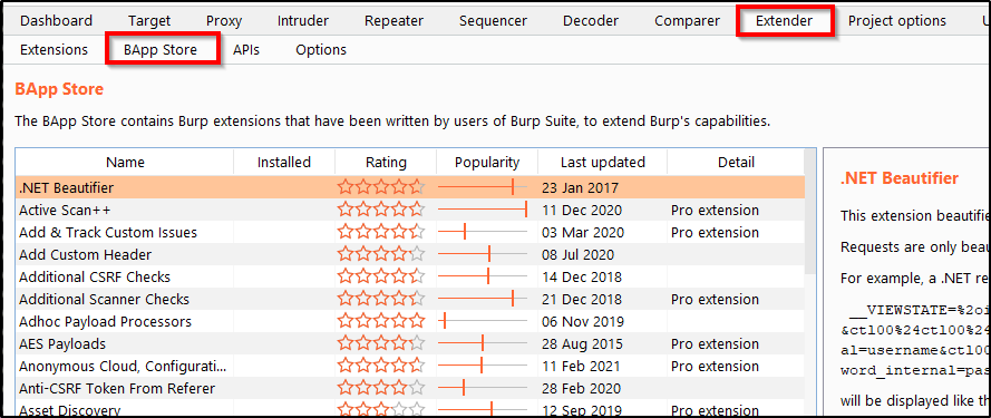 To install an extension, head over to the Extender tab of Burp Suite, and then select BApp Store.
