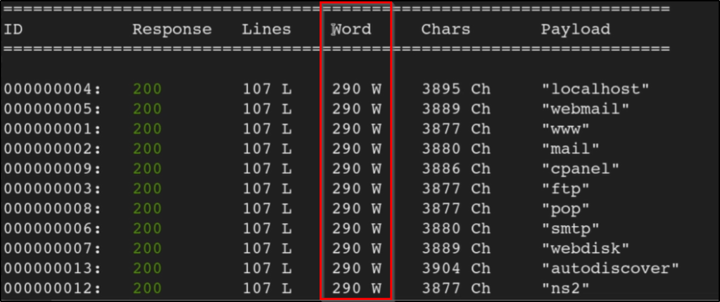 Now you may get a ton of output that shows valid subdomains depending on how the site is configured. If you notice a large amount of results that contain the same word count, this may just be an indication that the site returns a 200 response, but it just displays a “Not found” error.