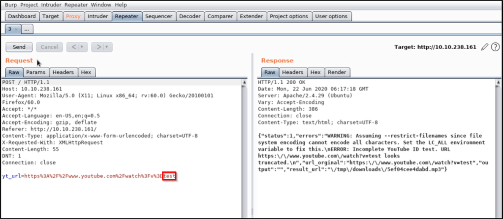 We find when intercepting the web request that there is a parameter being sent to the box called yt_url. Whatever value gets entered in the field will be passed into this parameter.