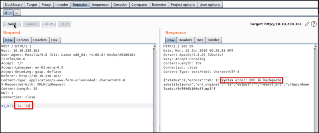 We try to take it further by running ls -la, but we find that this isn’t working properly. We likely have some sort of bad characters that we’ll need to bypass.