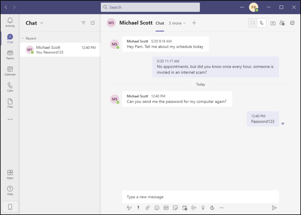So take a scenario where an end-user asks another end-user for help signing into an account. In this case, Michael Scott is asking Pam for his computer login since he can never remember. He sends the message through Teams, perhaps on his phone, and Pam replies.